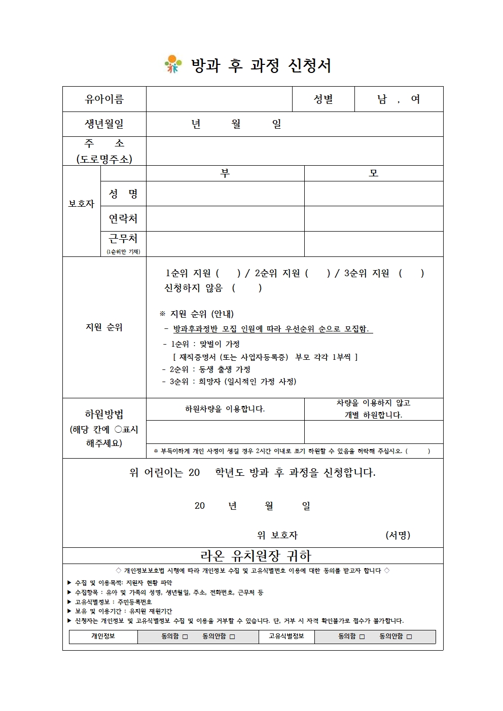 방과후과정신청서 양식입니다.